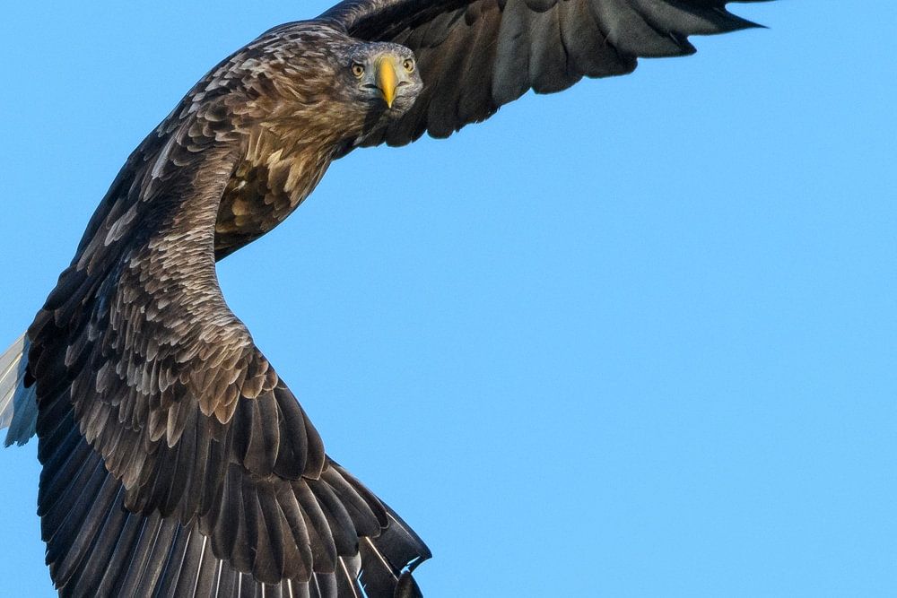 Zeearend of zeearend (Haliaeetus albicilla) jagend in de lucht boven een Fjord bij het eiland Vesteralen in Noord-Noorwegen.