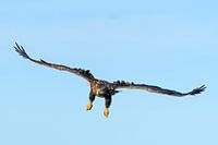 Zeearend of zeearend (Haliaeetus albicilla) jagend in de lucht boven een Fjord bij het eiland Vesteralen in Noord-Noorwegen.