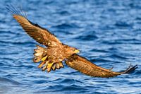 Zeearend (Haliaeetus albicilla) jagend in een Fjord bij Vesteralen eiland in Noord-Noorwegen tijdens een mooie winterdag.