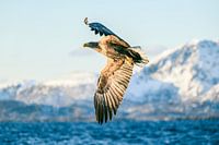 Zeearend vliegt tijdens de winter boven een fjord in Noorwegen. De arend heeft een grote spanwijdte en is op zoek naar voedsel. De fjord is omgeven door besneeuwde bergen, en het water van de fjord is gedeeltelijk bevroren. De zeearend is een grote roofvogel die inheems is op het noordelijk halfrond, en staat bekend om zijn opvallende witte staartveren en donkerbruine lichaam. Ze komen meestal voor in de buurt van water en zijn bekwame jagers. In Noorwegen worden ze beschouwd als een beschermde diersoort. De foto vangt de majestueuze schoonheid van het natuurlijke landschap en de krachtige aanwezigheid van de zeearend.