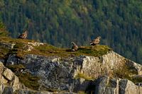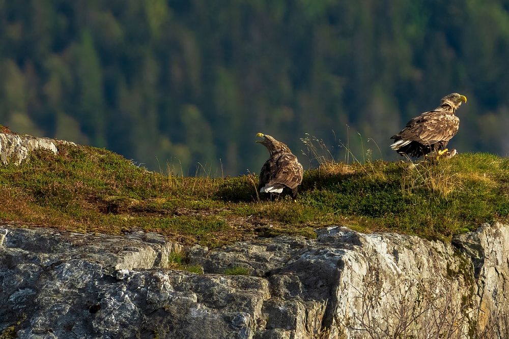 Deze zomer deze schitterende zeearenden in noorwegen, in het fjord van Leka mogen vastleggen. De linker zeearend op de foto heeft een vis in zijn klauwen. De rechter Zeearend is het jong, wat moet wachten op zijn beurt om te mogen eten.