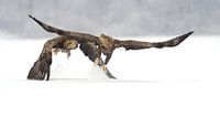 Twee Europese zeearenden (White-tailed Eagles) die elkaar achtervolgen in winterse omstandigheden boven een besneeuwd veld in het midden van Polen.