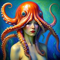 De inktvis en de dame lijken één te zijn, een fascinerende fusie van mens en zeeleven. De inktvis' tentakels omlijsten het gezicht van de dame, waardoor de grenzen tussen hun werelden vervagen. De dame straalt rust uit, alsof ze in harmonie leeft met haar maritieme metgezel.