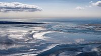 Het zeegat genaamd Engelschmangat tussen Texel en Vlieland. In het tegenlicht van de zon, links het silhouet van het noorden van Texel; recht de uiterste zuidwest punt van Vlieland. Op de voorgrond de Waddenzee, en achtergrond de Noordzee met scheepvaart en boorinstallaties.