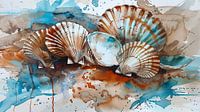 Dit rustgevende, dynamische waterverfschilderij toont een verzameling van schelpen tegen een achtergrond die doet denken aan de beweging van water en zand.
