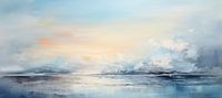 Zeegezicht | Schilderij Zeegezicht - Dit schilderij biedt een dynamische interpretatie van een zeegezicht tijdens zonsop- of ondergang, waarbij de weerspiegeling in het water en de beweging van de lucht boven het landschap centraal staan. Met een impressionistische toets in een modern kleurenpalet, vindt men hier een harmonieuze mix van warme oranje en koele blauwtinten, aangevuld met zachte witte en grijze accenten die voor diepte en textuur zorgen.