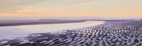 Een kleurrijk panorama beeld van het Nederlandse strand met de Noordzee in de winter bij een zonsondergang. Een sfeervol beeld met op de voorgrond een patroon van de zand door weersinvloeden van eb en vloed