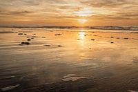 Bij zonsondergang transformeert het Noordzeestrand in een betoverend zeegezicht, waar hemel en zee samensmelten in een kleurrijk schouwspel. De ondergaande zon schildert de lucht in tinten van goud, oranje en roze, terwijl het licht glinstert op de golven die zachtjes het strand op rollen. De horizon vervaagt in de verte, waar het water de lucht ontmoet in een eindeloos ogende lijn.