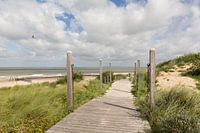 Een zonnige, zomerse foto met zicht op de zee vanuit een planken pad met meerpalen erlangs aan de rand van het duin bij Nieuwvliet-Bad aan de kust in Zeeuws-Vlaanderen.
