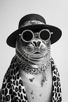 Zwart-wit afbeelding van een zeehond in een modieuze pose, gekleed met een hoed, een sierlijke zonnebril en een sjaal met luipaardprint.