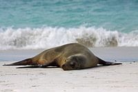 Deze foto is genomen op de Galpagos eilanden. Op diverse eilanden leven zeehonden die goed te fotograferen zijn. Deze was waarschijnlijk erg moe want hij kwam uit het water gezwommen, is hier gaan liggen en heeft zich een half uur niet bewogen