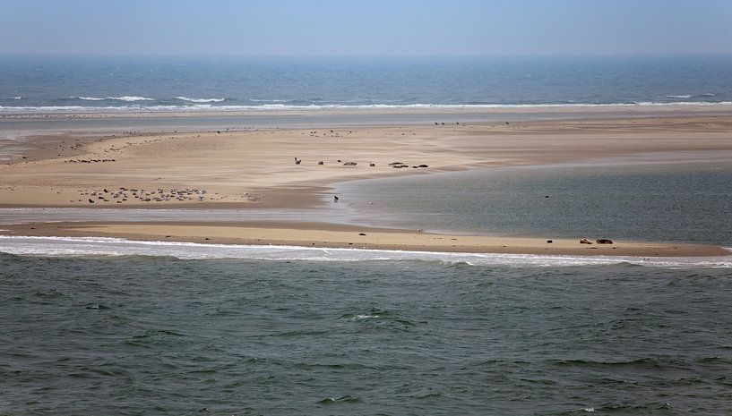 Zeehonden en zeemeeuwen op een zandbank in de Noordzee