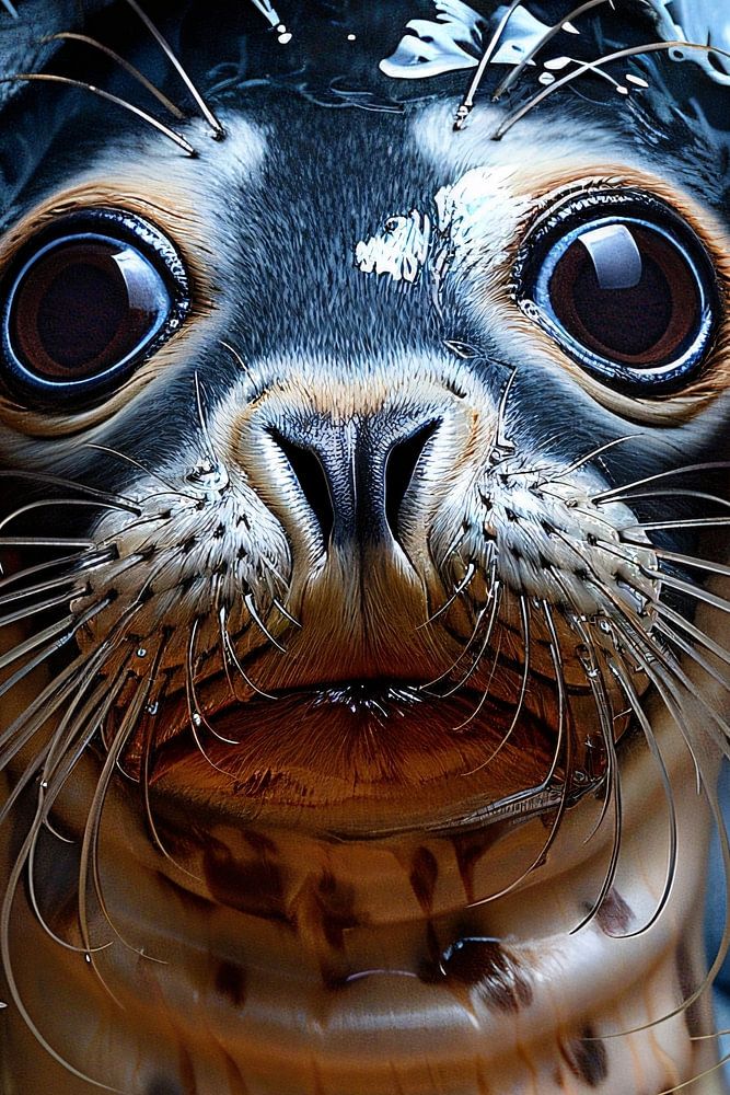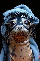 Dit schattige zeehondje, gewikkeld in een zachte, blauwe handdoek, kijkt je met grote, nieuwsgierige ogen aan. Het contrast tussen zijn donkere vacht en de heldere handdoek benadrukt zijn onschuldige charme. De waterdruppels op zijn vacht en de handdoek herinneren aan zijn natuurlijke habitat, terwijl de donkere achtergrond hem in het middelpunt van de belangstelling plaatst. Dit kunstwerk brengt een gevoel van warmte en tederheid in elke ruimte.