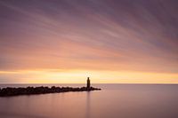 Zeeland zonsondergang vanaf het strand van de Brouwersdam. Een typisch Zeeuws landschap. De foto van deze bekende strekdam met meerpaal is gemaakt met een lange sluitertijd.