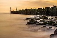 Het strand van Westkapelle is een fotogeniek strand. Ik ben er graag met eb en vloed, en leg dan de kracht van het water graag vast met lange sluitertijden. De plek waar ik stond trok me aan vanwege de combinatie van mooie rotsen, een palenrij en de duiven die erop zaten. Het werd langzaam vloed waardoor er steeds meer rotsen onder…