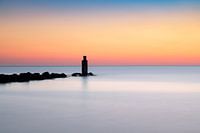 Zeeland bij zonsondergang, Nederland. De Brouwersdam met de strekdam op het strand gemaakt met een lange sluitertijd. Vanaf de Brouwersdam kijk je op de Noordzee. Zeeland staat bekend om zijn weidse uitzichten over water en zee, mooie stranden en zeer populaire locaties in de landschapsfotografie.