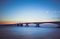 De welbekende Zeelandbrug in Nederland tijdens de zonsondergang. De foto is gemaakt met een Lange sluitertijd wat een melkachtig effect geeft op het water.