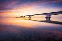 Een prachtig kleurrijke zonsopkomst aan de verstilde waterlijn bij de beroemde Zeelandbrug.