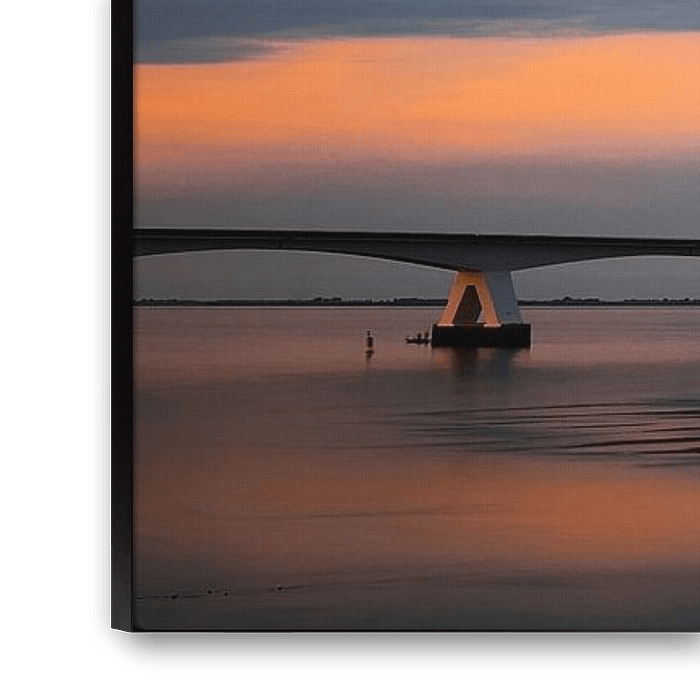 Zeelandbrug bij laag water, hierdoor is de zandbank voor de brug zichtbaar. De zon staat heel laag links buiten beeld en verlicht de brug met rood/orange licht.