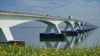 Iconische Zeelandbrug met een lengte van ca. 5 km verbindt de eilanden Noord-Beveland met Schouwen-Duiveland over de Oosterschelde. Op de voorgrond een zomers gele bloemenzee. Windstil weer geeft een schitterende weerspiegeling in het water. Gebouwd in 1965 met de oorspronkelijke naam: Oosterscheldebrug.