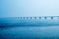 De Zeelandbrug was bij de bouw de langste brug van Europa. Deze foto is uitgevoerd in een blauw licht