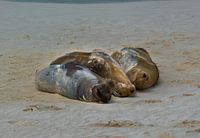 Drie zeeleeuwen slapen op het strand van een Galapagos eiland in Ecuador, Zuid Amerika
