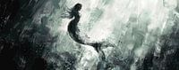 De dominante kleuren zijn koele tinten van grijs en blauw, wat een kalmerende en dromerige sfeer creëert. De zeemeermin is centraal geplaatst, haar silhouet scherp afgetekend tegen de abstracte…