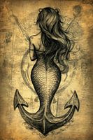 Het meest opvallende kenmerk is de overgang van de staart van de zeemeermin naar een anker. De visschubben van haar staart vervagen geleidelijk en transformeren in de stevige, metalen vorm van het anker. Deze naadloze fusie symboliseert de verbinding tussen de mysterieuze diepten van de zee en de stabiliteit die zeelieden zoeken.