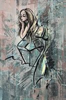Kunstwerk van een zeemeermin die leunt op een grote diamant. Dit werk is gemaakt in donkere tinten blauw en roze gecombineerd met fel geel en zwarte lijnen.