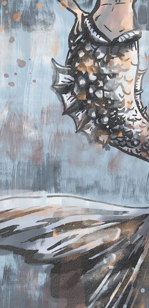 Staand formaat schilderij van een zeemeermin. Dit kunstwerk bevat blauwe kleuren met lichte en donkere schakeringen. Deze prachtige meermin lijkt geschrokken te zijn van de gene die haar heeft ontdekt. Naast de aqua blauwe tinten vind je ook oranje en roestbruine accenten terug.