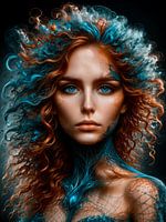 A.I. kunst van een zeemeermin deels gevangen in een net. Met prachtige kleuren oranje en blauw. Een fantasierijke blikvanger voor aan je muur!