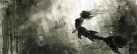 Dit kunstwerk toont een zeemeermin in een mystieke onderwaterwereld. De kleuren zijn overwegend in grijstinten, wat een sfeer van mysterie en sereniteit creëert.