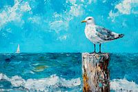 Koop dit schilderij Zeemeeuw aan zee met zeilboot van Poster Art Shop als reproductie geprint op canvas, aluminium dibond, (ingelijste) fotoprint, behang en ArtFrame. Voor jou op maat geprint in Fine-Art kwaliteit.