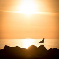 Lachende meeuw op het strand en aan zee bij zonsopgang bij Scharbeutz en Timmendorf aan de Oostzee.