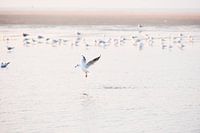 Zeemeeuw vliegt boven een vijver met zeewater op zoek naar voedsel bij de zandmotor Deltduin aan de Nederlandse kust tussen Den Haag en Hoek van Holland