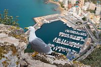 Een zeemeeuw rust uit op de top van de Peñón de Ifach. Hij kijkt uit over de blauwe zee, de jachthaven en de stedelijke architectuur van de kustplaats Calpe. Het natuurpark Peñón de Ifach in Calpe is het leefgebied van talloze meeuwen en een uitstekend uitkijkpunt aan de Middellandse Zeekust. Het kleinste natuurreservaat op het Spaanse vasteland is ook een prachtige bestemming om te wandelen en te klimmen.