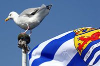 Zeemeeuw op Zeeuwse vlag. Vogel op een vlaggenstok met een wapperende Zeeuwse vlag.