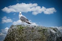 Zeemeeuw op een steen bij een fjord in Noorwegen. Vogel in het hoge noorden van Scandinavië.