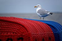 Aan de kust een zeemeeuw op een rode en blauwe strandstoel