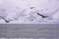 rustgevend gezicht de zwevende meeuwen die zich laten dragen door de stevige noordzeewind.
