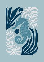 Dit op de kust geïnspireerde kunstwerk toont een sierlijk zeepaardje omringd door vloeiende zeeplanten, die de stille poëzie van het onderwaterleven vastleggen. De zachte blauwe tinten en organische lijnen weerspiegelen een wereld van kalme beweging en natuurlijke harmonie.