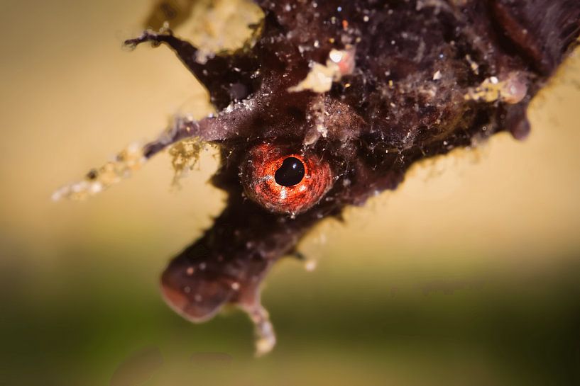 Deze dramatische onderwaterclose-up toont de intense aanwezigheid van een zeepaardje in prachtige details. Het opvallende rode oog wordt het middelpunt en straalt tegen de aardse texturen en warme, zacht wazige tinten op de achtergrond. Van zo dichtbij gezien verandert het zeepaardje in een levend beeldhouwwerk: ruw, delicaat en perfect…
