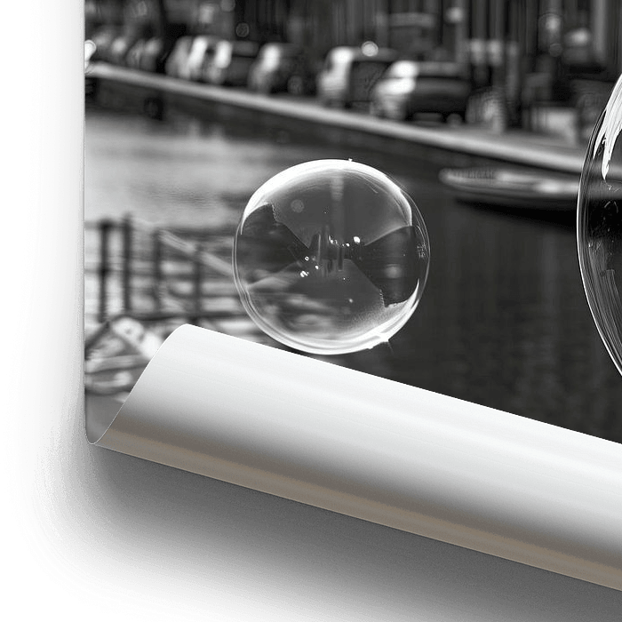 In de fascinerende zwart-witfoto "Soap Bubbles" ontvouwt het schilderachtige landschap van een Amsterdamse gracht zich voor onze ogen. Het contrast tussen licht en schaduw geeft het beeld een unieke diepte en benadrukt de nostalgische schoonheid van deze iconische stad.