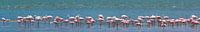 Panorama van foeragerende flamingo's. De foto is genomen voor de kust van Namibië, bij Walvisbaai.