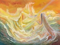 De afbeelding van de brug, die in zee lijkt te zinken, kan worden gezien als een symbool van vergankelijkheid en verandering. Het herinnert ons eraan dat zelfs solide structuren en verbindingen na verloop van tijd kunnen verdwijnen, dat veiligheid en betrouwbaarheid soms op de proef worden gesteld. De ruwe zee en krachtige golven kunnen de onvoorspelbare worstelingen en tegenslagen vertegenwoordigen die het leven beïnvloeden en uitdagingen met zich meebrengen. Het vliegtuig met rechte vliegbaan is een interessante factor voor de kijker.
