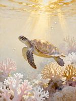 Een zeeschildpad glijdt langzaam door melkachtig turquoise water, omgeven door zachtroze en gouden koraal. De zon strijkt warm over haar schild en laat het water dansen in gouden tinten. Een kalm, bijna tijdloos tafereel — alsof de oceaan zelf even de adem inhoudt.