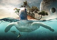 De zeeschildpad met een eigen eiland op zijn rug. Kijken in de camera. Een mooi surrealistisch werk in hoge kwaliteit. Een echte eyecatcher voor aan de wand en nergens anders verkrijgbaar.