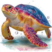 Met levendige kleuren en een speelse mix van blauw, oranje, geel en rood, lijken de schildpadden bijna uit het doek te zwemmen.