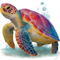 Met levendige kleuren en een speelse mix van blauw, oranje, geel en rood, lijken de schildpadden bijna uit het doek te zwemmen.