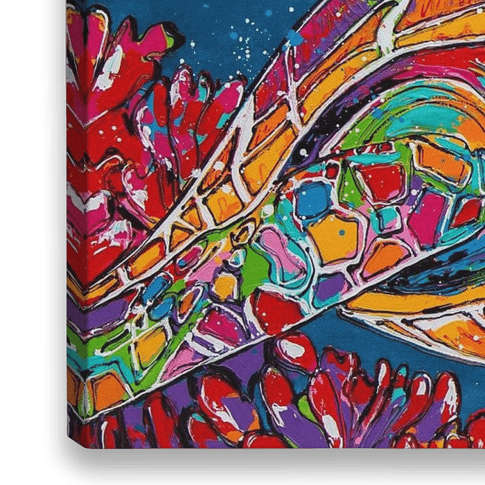 Dit prachtige schilderij toont twee zeeschildpadden die gracieus zwemmen te midden van een explosie van heldere kleuren, en zo een meeslepende scène creëren die de schoonheid van de oceaan tot leven brengt.